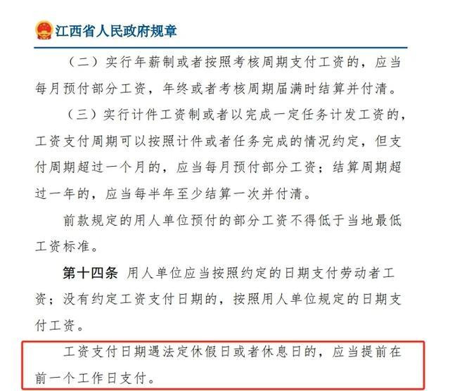 小编查阅了《江西省工资支付规定》,其中第十四条明确要求工资支付日期遇法定休假日或者休息日的,应当提前在前一个工作日支付。这一规定旨在保障劳动者合法权益,避免因节假日延误工资发放。(完整文件请点击“阅读原文”查看)